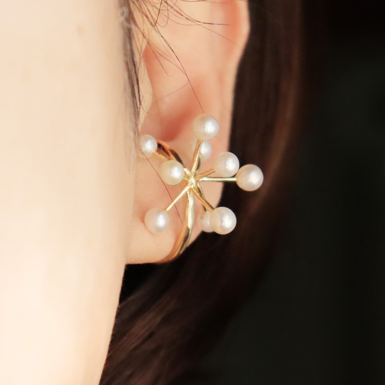 綿毛の様なデザインの先に淡水パールを付けて華やさを表現しています。